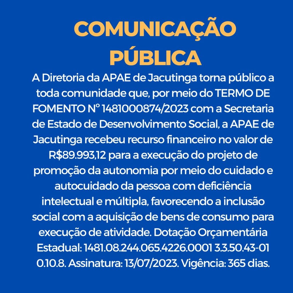 Fundada em 08 de setembro de 1993, a APAE de Jacutinga-MG, é uma organização da sociedade civil – sem fins lucrativos – que promove ações em favor de crianças, jovens e adultos com deficiência intelectual (associada ou não a outras deficiências).